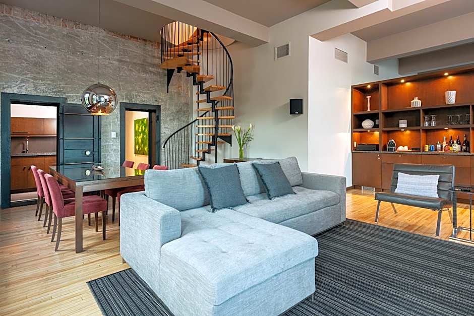 This penthouse suite includes a spacious living area with gas fireplace, a full kitchenette and dining area. The bathroom features a rainfall shower and a bath. There is a private rooftop terrace with a view of the St-Lawrence River and Cap Diamand.